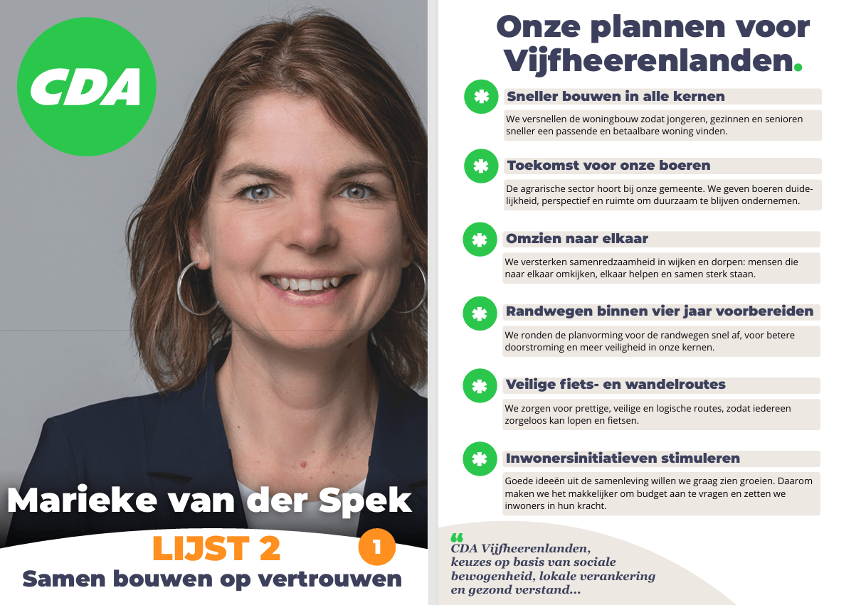 08-03-2026 Benieuwd naar onze plannen voor een Vijfheerenlanden waarin we omzien naar elkaar, waarin iedereen bijdraagt naar vermogen, waar zorgvuldig omgaan met onze omgeving en de financien, waar de overheid zegt wat'ie doet en doet wat'ie zegt? Lees dan verder!